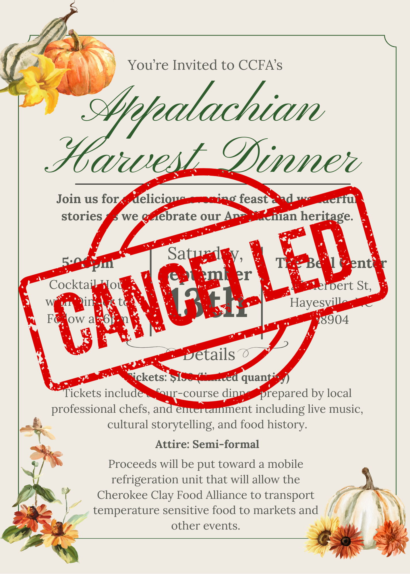 Unfortunately, we were not able to sell enough tickets to bring the Appalachian Harvest Dinner to fruition so we have made the tough decision to cancel this event.